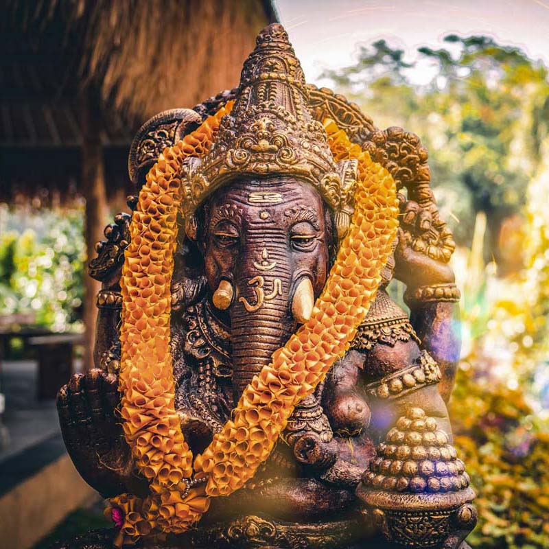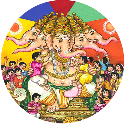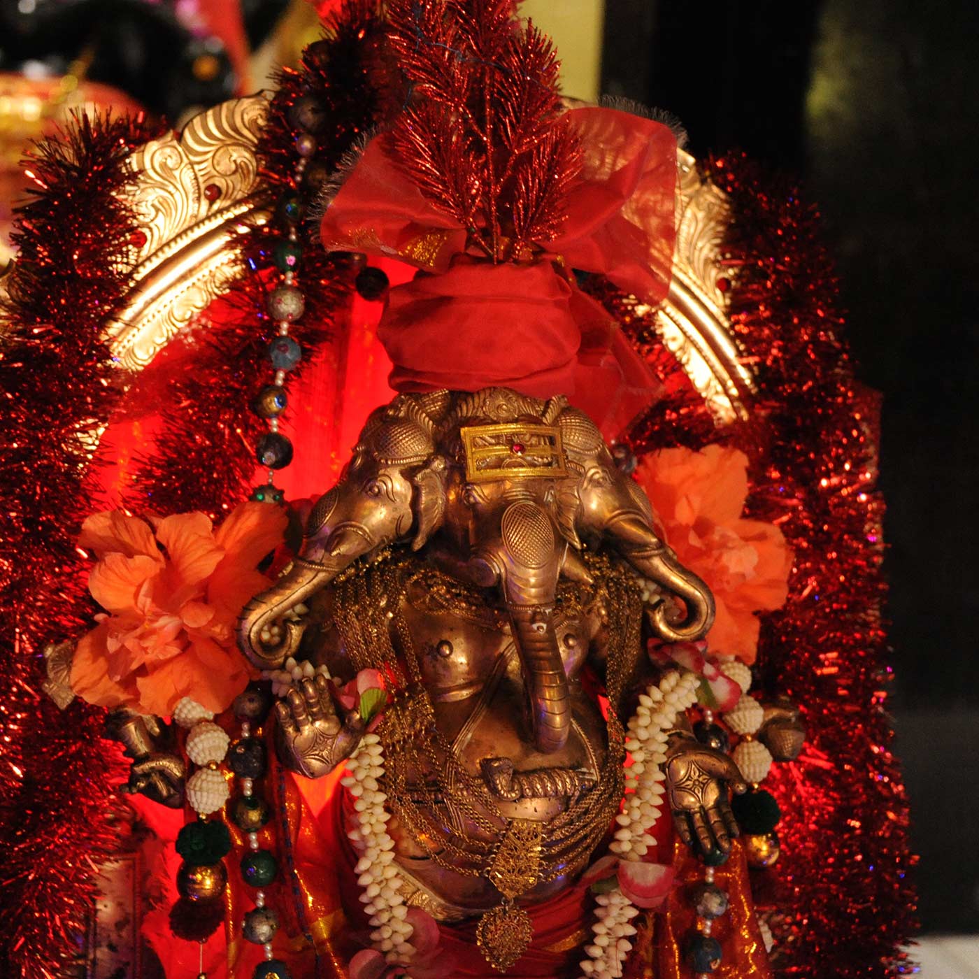 Pancha Ganapati includes outings, picnics, feasts and exchange of cards and gifts with relatives, friends and business associates. A special temporary shrine is created in the main living room or the shrine room and festively decorated. At the center is placed a large wooden or bronze statue of Lord Panchamukha (“five-faced”) Ganapati, a form of Ganesha. Any large picture or statue of Ganesha will also do. Each morning the children decorate and dress Him in the color of that day, representing one of His five rays of energy, or shaktis.